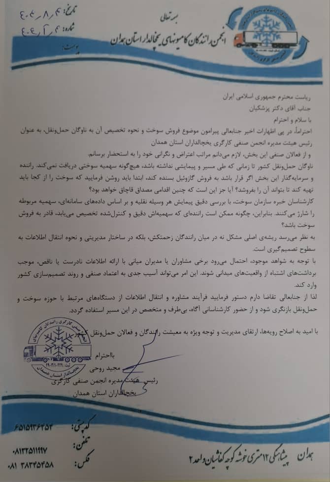 در پی اظهارات اخیر جناب آقای دکتر پزشکیان، رئیس‌جمهور ج.ا.ا، پیرامون تخصیص سوخت و نحوه فروش آن به ناوگان حمل‌ونقل، مجید روحی، رئیس هیئت‌مدیره انجمن صنفی کارگری یخچالداران استان همدان و فعال صنفی در این بخش، نامه‌ای به جناب پزشکیان ارسال کرده و اعتراضات و نگرانی‌های خود را در خصوص نحوه تخصیص و فروش سوخت در ناوگان حمل‌ونقل به ویژه در بخش یخچالداران مطرح کرده است. این گزارش به بررسی و تحلیل مفاد نامه و نکات مطرح‌شده در آن می‌پردازد.