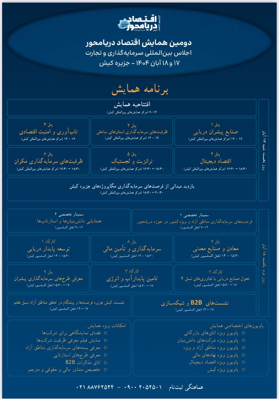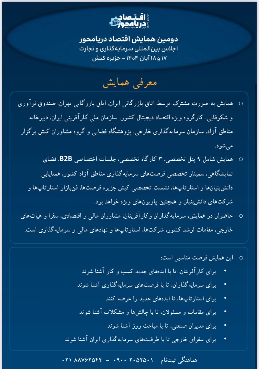 در میانه پاییز و بر پهنه آبی خلیجفارس، جزیره کیش بار دیگر به قلب تپنده گفتوگوهای اقتصادی کشور بدل میشود. دومین همایش اقتصاد دریامحور ایران، با محوریت توسعه سرمایهگذاری، فناوری و نوآوری در صنایع و مناطق ساحلی، طی روزهای ۱۷ و ۱۸ آبانماه برگزار خواهد شد.